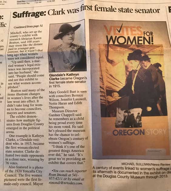 Read about and be inspired by an amazing woman who lived in Douglas County briefly who was the first woman to serve in Oregon Senate, Kathryn Clarke (1873-1940). See photo below.