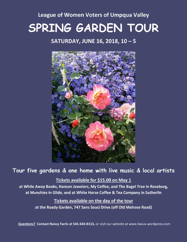 Tickets can also be purchased on the day of the Tour at the garden site located at 747 San Souci Drive. Look for the “League of Women Voters” table.
